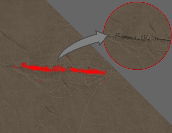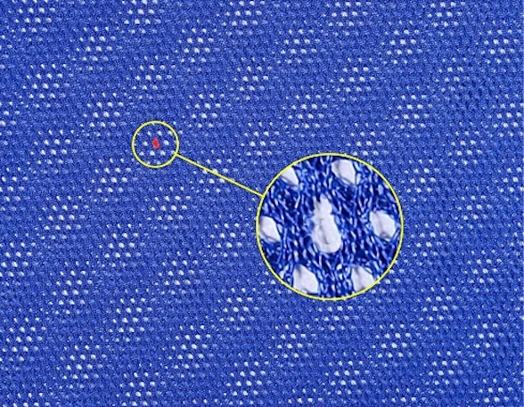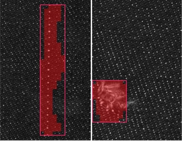Using the Anomaly Detector module, defect of previously unknown shape, pattern, and size are identified. Furthermore, the results are not diminished by an irregular patters on the fabric as it learns and recognizes the pattern, something that may be difficult with manual inspection. For clarity, the defect is always highlighted with a heat map.