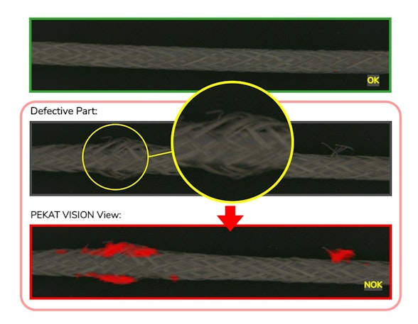 The integrity of the braided shielding is inspected using the Anomaly Detector module. Defects are easily identified and highlighted with a heat map. The module is trained only on defect free images