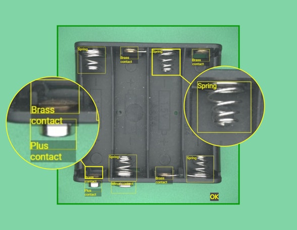 A simple example of component presence inspection. All components, including the brass contact, spring, minus and plus contacts are identified and confirmed