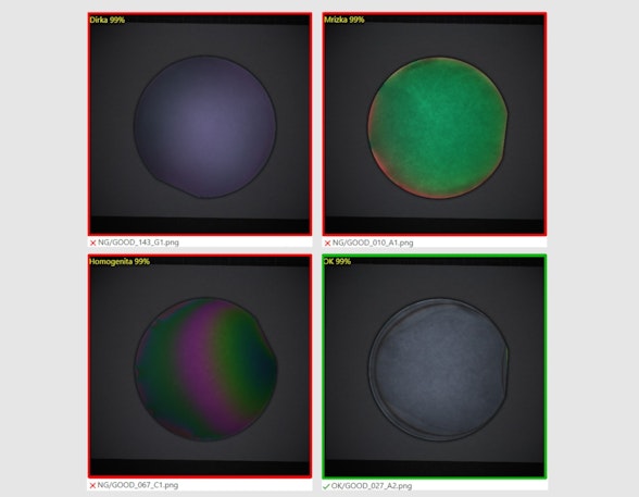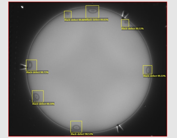 Internal defects are identified on a wafer using PEKAT VISION Object Detector and Classifier modules in the image above