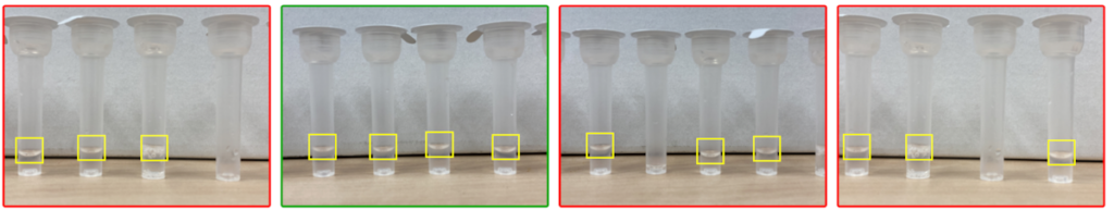 Firstly we acquired pictures – all of them containing 4 bottles with the fluid. Then we drew rectangles around the water level – we did that with approximately 5 photos that were used for the training.